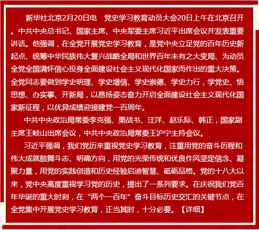 新華社北京2月20日電 黨史學(xué)習(xí)教育動(dòng)員大會(huì)20日上午在北京召開(kāi)。中共中央總書(shū)記、國(guó)家主席、中央軍委主席習(xí)近平出席會(huì)議并發(fā)表重要講話。他強(qiáng)調(diào),在全黨開(kāi)展黨史學(xué)習(xí)教育,是黨中央立足黨的百年歷史新起點(diǎn)、統(tǒng)籌中華民族偉大復(fù)興戰(zhàn)略全局和世界百年未有之大變局、為動(dòng)員全黨全國(guó)滿(mǎn)懷信心投身全面建設(shè)社會(huì)主義現(xiàn)代化國(guó)家而作出的重大決策。全黨同志要做到學(xué)史明理、學(xué)史增信、學(xué)史崇德、學(xué)史力行,學(xué)黨史、悟思想、辦實(shí)事、開(kāi)新局,以昂揚(yáng)姿態(tài)奮力開(kāi)啟全面建設(shè)社會(huì)主義現(xiàn)代化國(guó)家新征程,以?xún)?yōu)異成績(jī)迎接建黨一百周年。